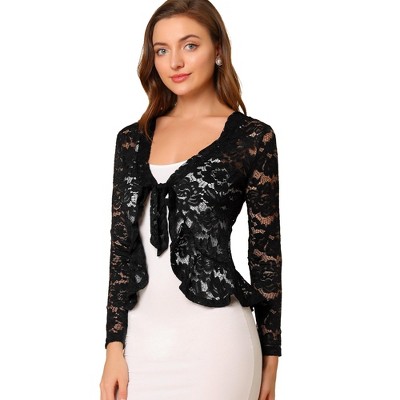 INSPIRE CHIC Women's Tie Front Ruffled Hem Floral Lace Sheer Crop Bolero Shrug
