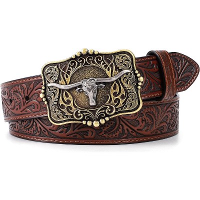 Cowboy Cowgirl Belt Western Belts for Men Women Floral Engraved Longhorn Bull Buckle Belt for Jeans