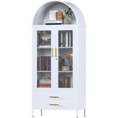 71″ Tall Arched Pantry Cabinet with 2 Drawers & Adjustable Shelves & Glass Doors, Modern Farmhouse Kitchen Storage Cabinet