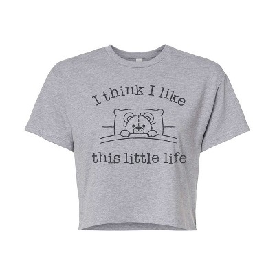 Women's - Instant Message - I Think I Like This Little Life Bear In Bed Cropped Graphic T-Shirt