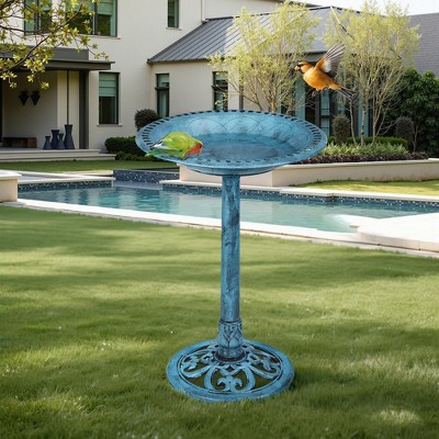 Etokfoks 27.25 Inch Blue Vintage Metal Pedestal Bird Bath Cast Iron Birds on Rim for Garden or Patio Outdoor Decoration 1 Piece