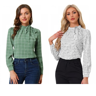 INSPIRE CHIC Women's Bow Tie Neck Keyhole Back Grid Checks Office Work Blouses 2 Packs