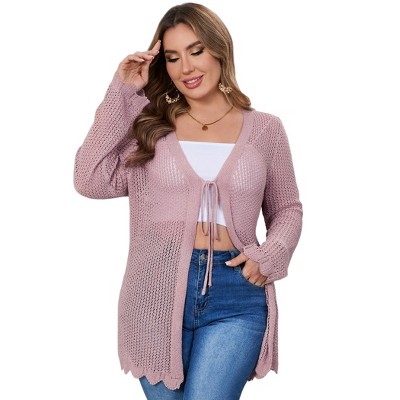 Clearlove Women's Plus Size Tie Front Knit Cardigan Hollow Out Long Sleeve Shrug Sweater