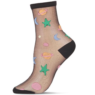Memoi Women's Colorful Outer Space Sheer Crew Socks Black 9-11