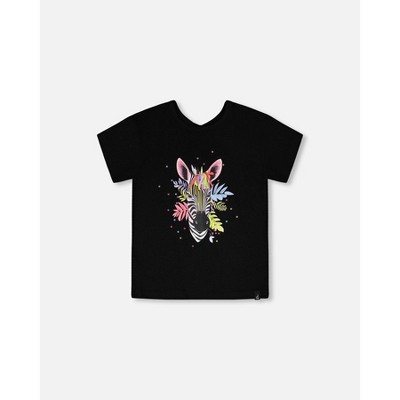 Deux par Deux Girl Organic Cotton Jersey T-Shirt Black with Zebra