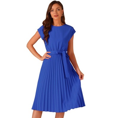 INSPIRE CHIC Women's Pleated Crew Neck Cap Sleeve Tie Waist A-Line Dresses