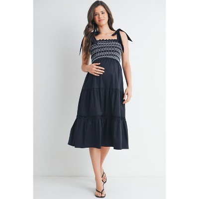 Hello Miz Women's Smocked Empire Waist Midi Maternity Dress with Shoulder Ties