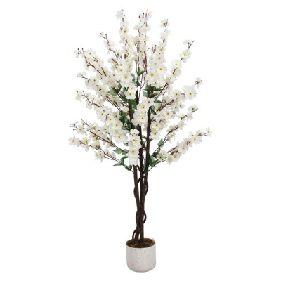 Faux Wintersweet Tree with Lifelike White Plum Blossoms and Black Planter, Artificial Potted Plant for Indoor Home or Office Décor