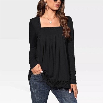 Women's Long Sleeve Tunic Tops - Plus Size Square Neck T-Shirt with Solid Color and Fall Lace Blouse,Black - 2XL