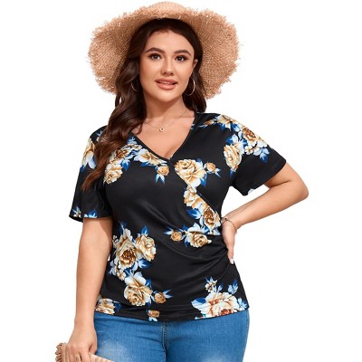 Women's Plus Size Shirt V Neck Pleated Blouse Short Sleeve Tunic Floral Top