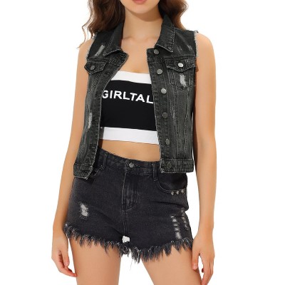 Allegra K Women's Turn Down Collar Button Closure Sleeveless Washed Distressed Denim Vest