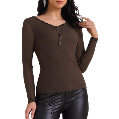 INSPIRE CHIC Women's Semi Sheer Long Sleeve Ruched V Neck Sequin Panel Casual Party Shirt