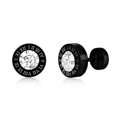 Metallo Mens Stainless Steel CZ Stud Roman Numberals Earrings - Black Plated - Black