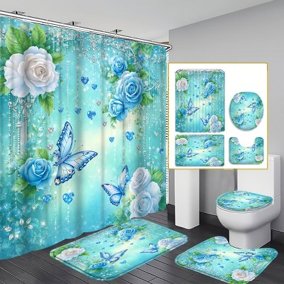 - blue bathroom curtain