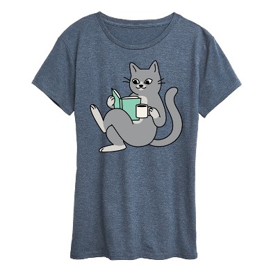 Women's - Instant Message - Reading Cat Coffee Short Sleeve Graphic T-Shirt
