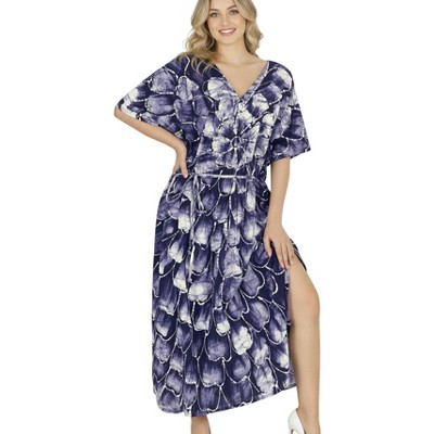 LEELA Womens Summer Holiday Beach Casual Dailywear Maxi Nightdress Cover Up Gown Caftan Loungewear Dashiki House Dresses for Women 3X-4X Blue, Floral