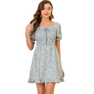 Allegra K Women's Puff Short Sleeve Sweetheart Neck Floral Smocked Bodycon Mini Dress