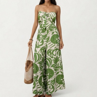 Anna-Kaci Women's Strapless Wide Leg Jumpsuit with Tropical Print Front Tie Detail and Relaxed Flowy Fit Design