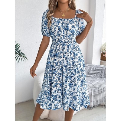 Floral Dresses for Women's Puff Sleeve Smocked Square Neck Milkmaid Midi Dress