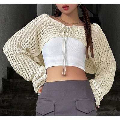 Women's Tie Front Long Sleeve Rib Knit Shrug Sweaters Cardigan Crop Top
