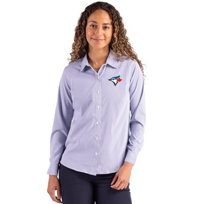 Toronto Blue Jays Cutter & Buck Skyline Epic Confidence Recycled Pinstripe Womens Long Sleeve Dress Shirt - Tour Blue/White - Small