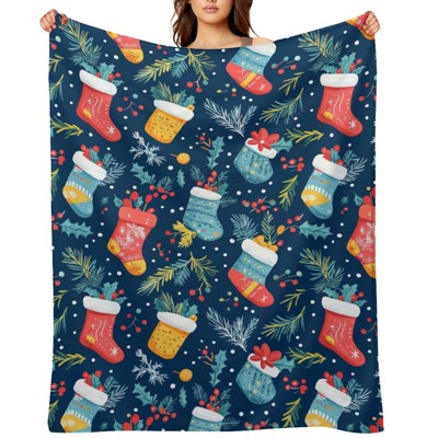 Soscooter Holiday Flannel Throw Blanket Christmas Stocking Pine Branch Holly Berry Dark Blue Background Festive Throw Blanket 30x40 inches