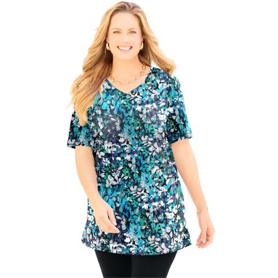 Woman Within Perfect Printed Short-Sleeve Shirred V-Neck Tunic