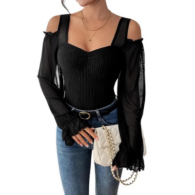 Coolmee Women's Off Shoulder T Shirt Ruched Sheer Bell Long Sleeve Romper