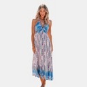Boho Print Tiered Maxi Dress with Long Sleeves High Neck Smocked Dress with Tie Waist