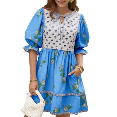 Womens Casual Floral Mini Dress Summer Puff Short Sleeve Tie Front V Neck Patchwork Loose Boho Shirt Dresses