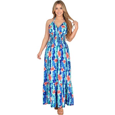 LA LEELA Womens House Daily Routine Evening Wear Boho Halter Smocked Mini Flowy Casual Backless Dress Tube Top Strapless for Women One Size Blue Tree