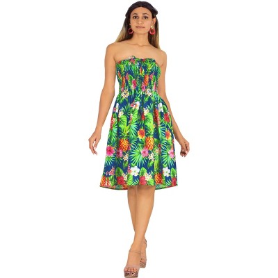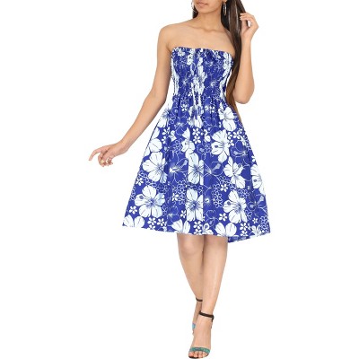 LA LEELA Womens House Daily Routine Evening Wear Holiday Backless Boho Smocked Mini Swing Dress Tube Top Dresses for Women One Size Blue, Floral