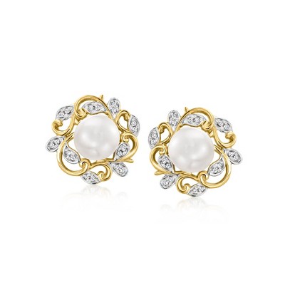 Ross-Simons 7-7.5mm Cultured Pearl and .10 ct. t.w. Diamond Leaf Earrings in 14kt Yellow Gold