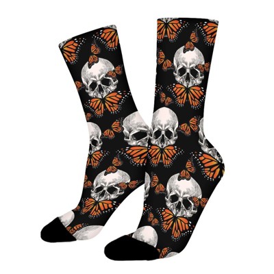 Skull And Orange Butterfly Women Printed Crew Socks Funny Funky Socks Soft Polyester Novelty Gifts for Artists Men