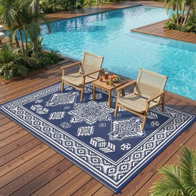 Navy/White Reversible Plastic Doormat – Waterproof, Stain-Resistant, 8'x10' Collapsible for Patio, Garden, RV, Outdoor Spaces