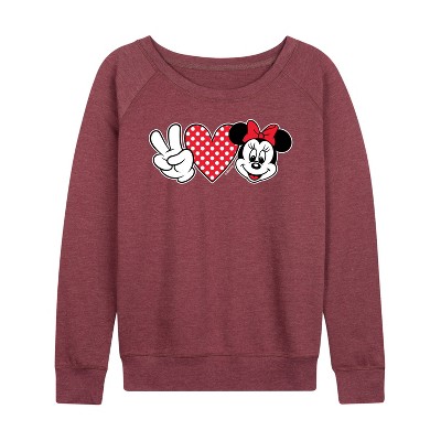 Women's - Disney - Peace Love Minnie Mouse Lightweight French Terry Wide Neck Long Sleeve Graphic Shirt