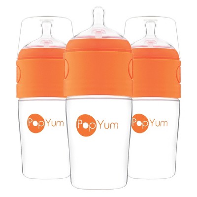 PopYum 9oz Anti-Colic Baby Bottle for Breast and Formula Feeding, 3-Pack, Orange, #2 Medium Flow Nipples
