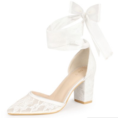 BLISSFUL STEP Women's Valentines Lace Closed Toe Lace Up Bridal Block Heel Pumps
