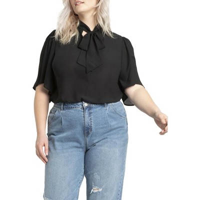 Slickblue Waterfall Frill Pleated Sleeve Blouse , Plus Size Shirt , Bow Detail Style , Black, 1XL