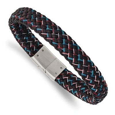 Black Bow Jewelry 12mm Stainless Steel Black Leather Multicolor Wire Bracelet, 8.25 Inch