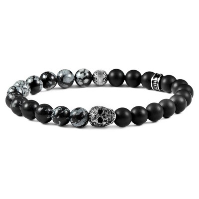 Crucible Men's Skull with Snowflake Agate and Matte Onyx Stone Beads Stretch Bracelet