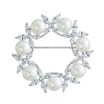 Bling Jewelry Elegant CZ Cubic Zirconia Round White Pearl Wreath Circle Scarf Pin Brooch