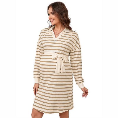 Maternity Sweater Dress Long Sleeve Collar V Neck Striped Belted Baby Shower Midi Dress