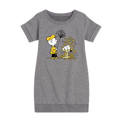 Girls' - Peanuts - Charlie Brown Snoopy Fall Leaves Graphic Short Sleeve Fleece Dress