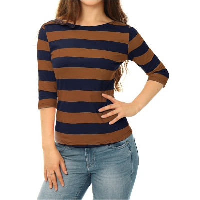 INSPIRE CHIC Women's Stripes Casual Basic Elbow Sleeves Boat Neck Slim Fit T-Shirts
