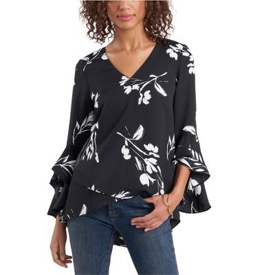 INSPIRE CHIC Women's High Low 3/4 Bell Sleeve Keyhole Back Ruffle Hem Asymmetrical Blouse