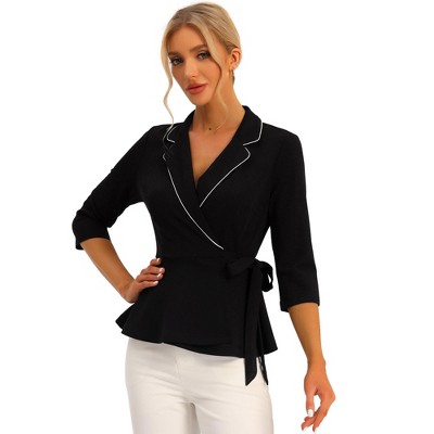 Allegra K Women's Notch Lapel Collar 3/4 Sleeve Tie Waist Peplum Top