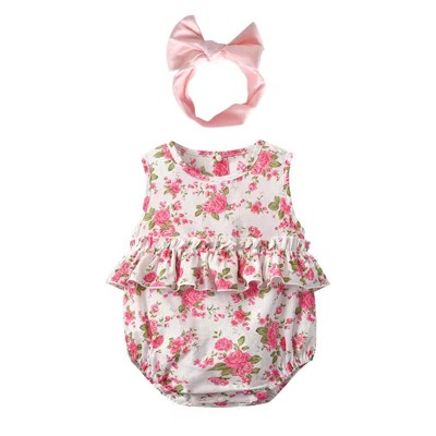 MyKids-Usa Baby Girl Floral Print Graphic Ruffle Design Sleeveless Bodysuit & Headband