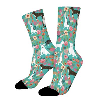 Bull Terrier Vintage Florals Women Printed Crew Socks Funny Funky Socks Soft Polyester Novelty Gifts for Artists Men