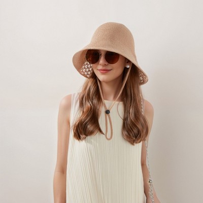 Anna-Kaci Crochet Bucket Hat with Adjustable Chin Strap and Back Button Eyelet Panel for Sun Protection
